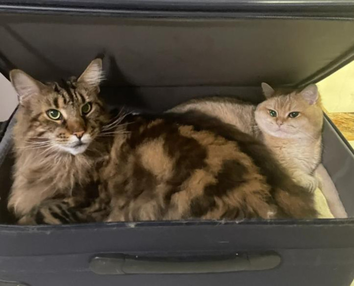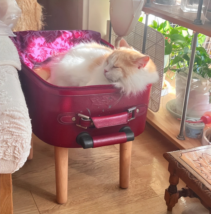 就是把行李箱上下两个部分拆开,然后去网上买一些桌腿,把桌腿固定在箱子下面,放在家里,这不就是猫窝吗?