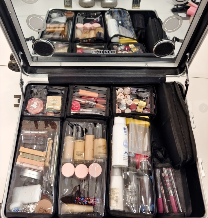 做法也很简单,固定一个镜子之后,在行李箱里面固定一些收纳盒,一个就可以储物、又可以照镜子的化妆箱就做好了。