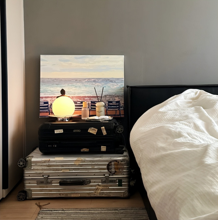 还可以把两个尺寸大小不一样的行李箱,叠着放在一起,也可以当成床头柜用。
