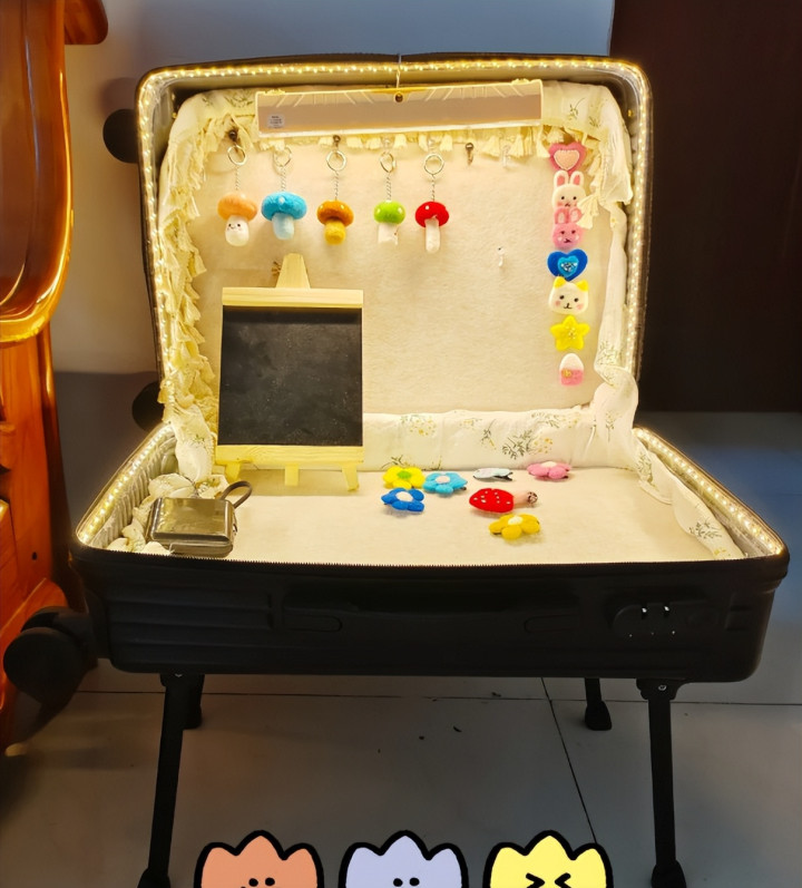 可以把售卖的东西,全都放在行李箱里面,用的时候打开,收摊的时候,把行李箱合上,拉链拉上就行了。
